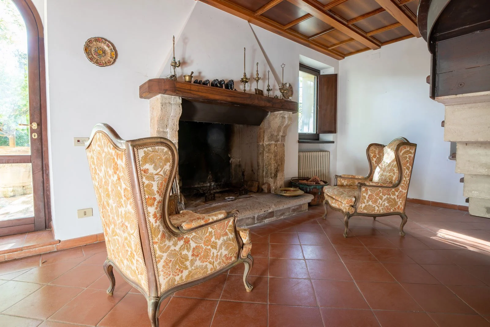 From the main entrance, you access a spacious living area featuring coffered wooden ceilings, terracotta floors, and a stone fireplace. The ground floor also includes a fully equipped masonry kitchen, a guest bathroom, and a study that opens onto the living area.